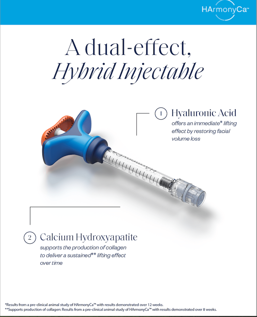 HArmonyCa™ is a hybrid injectable designed to deliver dual effects. Its active components are hyaluronic acid (HA) and calcium hydroxyapatite (CaHA). Hyaluronic acid provides an immediate lifting effect, while calcium hydroxyapatite stimulates new collagen production, creating a long-term lifting and skin-rejuvenating effect. Together, these ingredients enhance the skin’s structure and appearance.